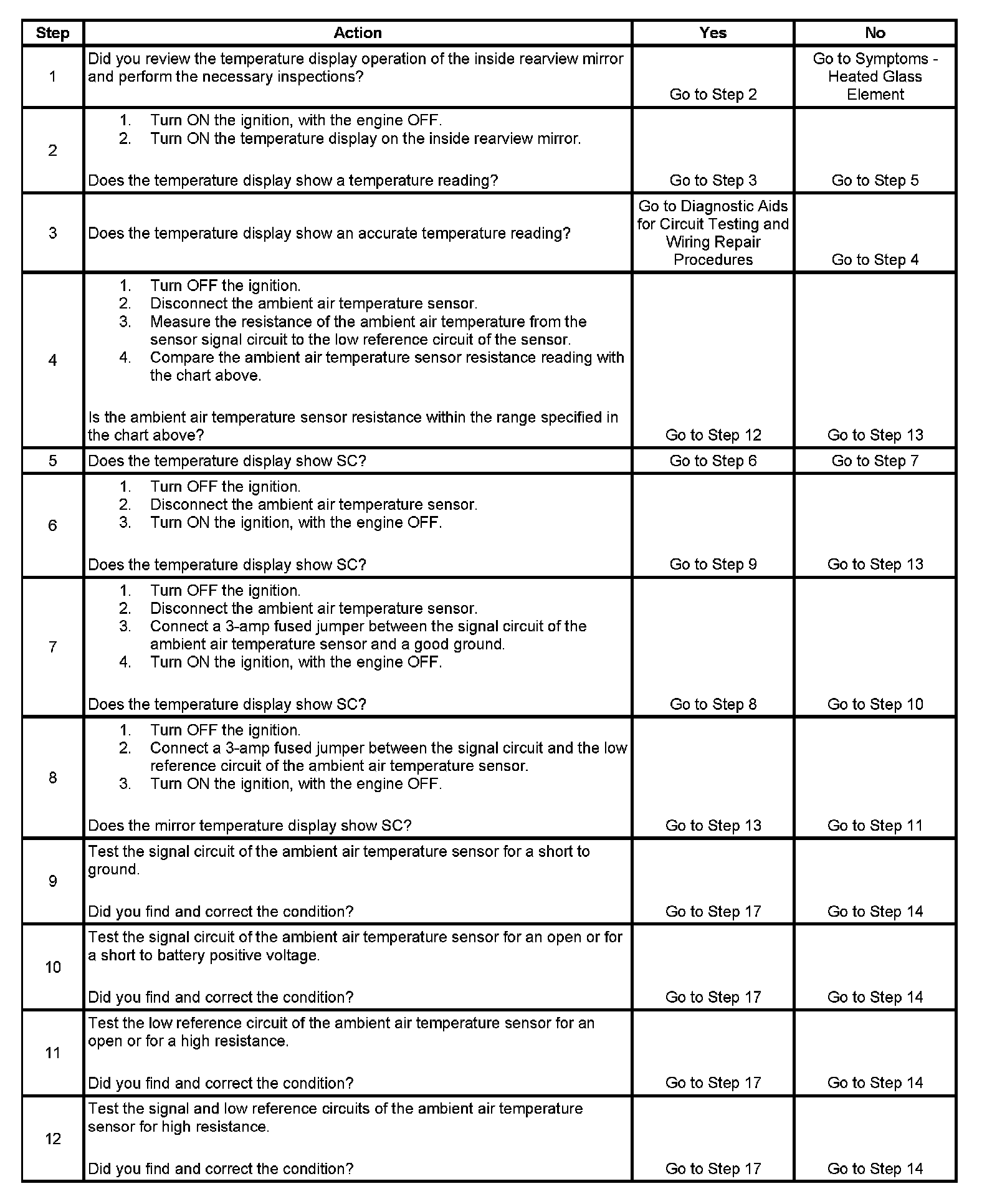 The table will be used to measure the resistance of the sensor and compare it with the actual ambient temperature. The mirror's temperature accuracy should be within 5 degrees of the actual temperature. The actual temperature should not be taken from a radio station, a sign displaying the temperature, etc. A temperature measuring tool such as a thermometer should be used. Some temperature measuring tools may be within 5 degrees of the actual temperature. Make sure to consult the manufacturer for the accuracy of the tool. This comparison can make the mirror seem off by 5-10 degrees of the actual temperature when it is not.