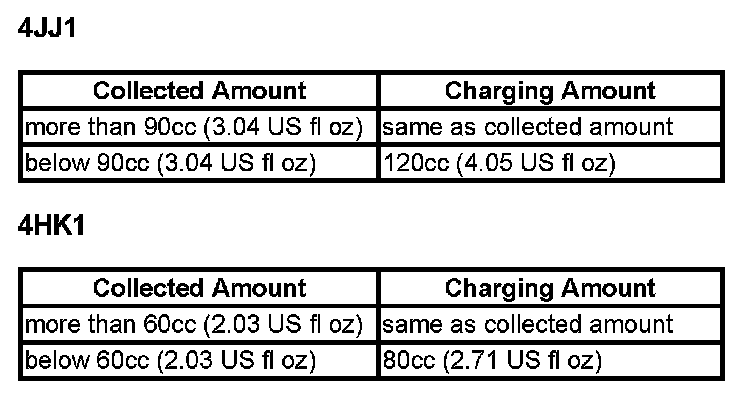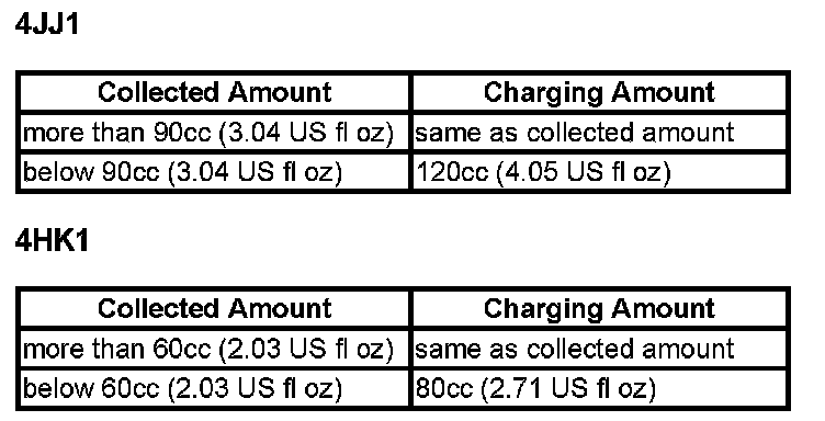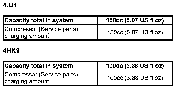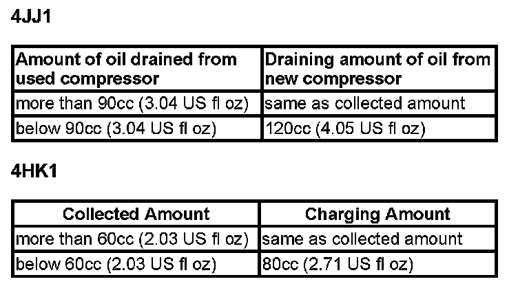 150cc (5.07 US fl oz) [4JJ1] or 100cc (3.38 US fl oz) [4HK1] of oil is charged in compressor (service parts). So it is necessary to drain the proper amount of oil from new compressor.