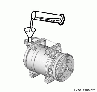 Supply 60cc (2.03 US fl oz) of oil to the compressor and install it onto the vehicle.