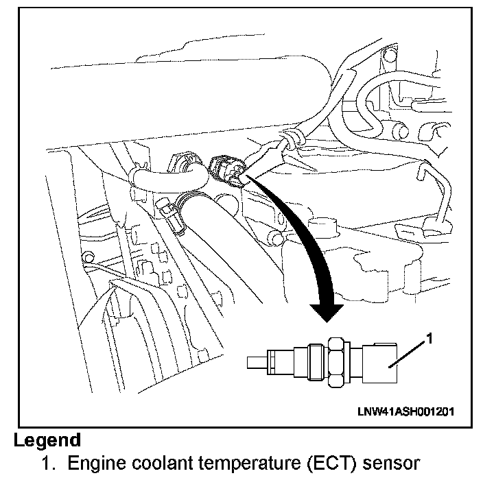Engine Coolant Temperature (ECT) SensorThe engine coolant temperature (ECT) sensor is installed on the thermostat housing. It is a variable resistor. The ECT sensor has a signal circuit and a low reference circuit. The ECT sensor measures the temperature of the engine coolant. The engine control module (ECM) supplies 5 volts to the ECT signal circuit and a ground for the ECT low reference circuit. When the ECT sensor is cold, the sensor resistance is high. When the engine coolant temperature increases, the sensor resistance decreases. With high sensor resistance, the ECM detects a high voltage on the ECT signal circuit. With lower sensor resistance, the ECM detects a lower voltage on the ECT signal circuit.
