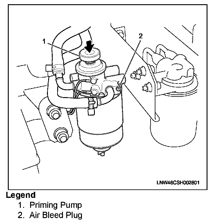c. Tighten the plug, and operate the priming pump more than 10 times until it is filled with fuel. After waiting for approximately a minute, loosen the plug and bleed out the air in the fuel filter. (This work must be repeated a minimum of three times until no more air comes out from the plug.)