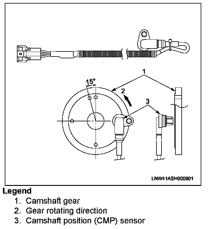 Camshaft Position (CMP) SensorThe camshaft position (CMP) sensor is installed on the cylinder head at the rear of the camshaft gear. The CMP sensor detects a total five through holes (four holes arranged equally every 90 deg. and one reference hole, on the camshaft gear flange surface) and sends signals to the engine control module (ECM). Receiving these signals, the ECM determines cylinder #1 compression top dead center (TDC). If the CMP sensor fails, the crankshaft position (CKP) sensor signals will substitute for the CMP sensor signals back up.