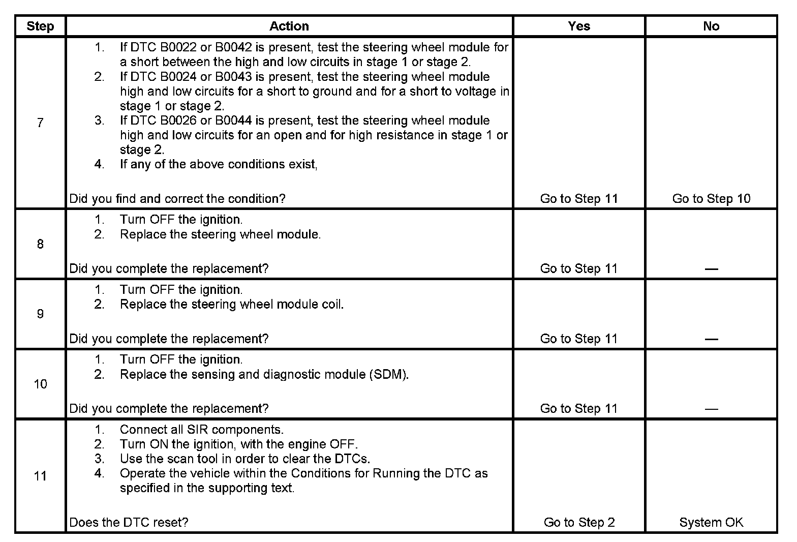 7. Determines which DTCs are present. If DTC B0022 or B0042 is present, test the steering wheel module for a short between high and low circuits in stage 1 or stage 2. If DTC B0024 or B0043 is present, test the steering wheel module high and low circuits for an open and for high resistance in stage 1 or stage 2. If DTC B0026 or B0044 is present, test the steering wheel module high and low circuits for an open and for high resistance in stage 1 or stage 2.