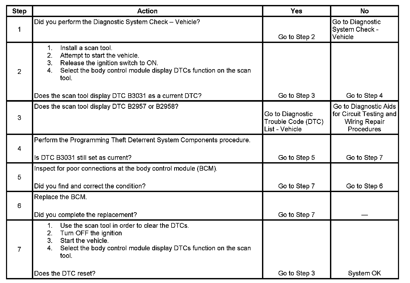 - If DTC B3031 is set in the BCM as a history DTC, clear the DTC and recheck the system. A history DTC B3031 indicates that the BCM has successfully completed the programming mode.