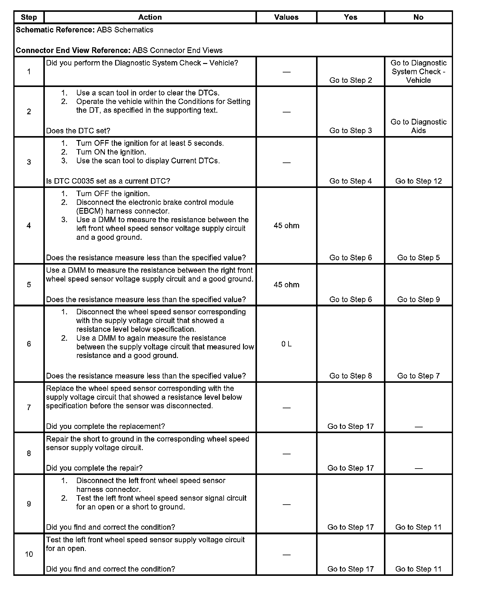 5. A short to ground in the right front wheel speed sensor supply voltage circuit appears electrically the same to the EBCM as a short to ground in the left front wheel speed sensor supply voltage circuit. Therefore, a short to ground in either circuit sets DTC C0035 and each circuit must be tested.