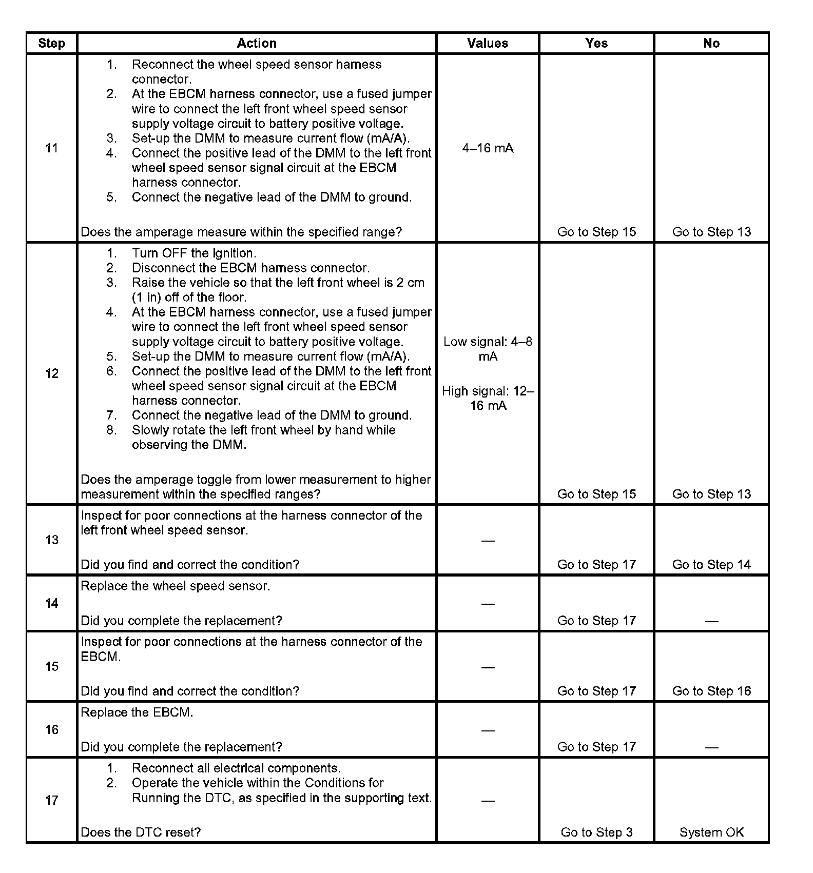 3. If the DTC sets when the vehicle is not moving, the EBCM is detecting an open or shorted wheel speed sensor or wheel speed sensor circuit.