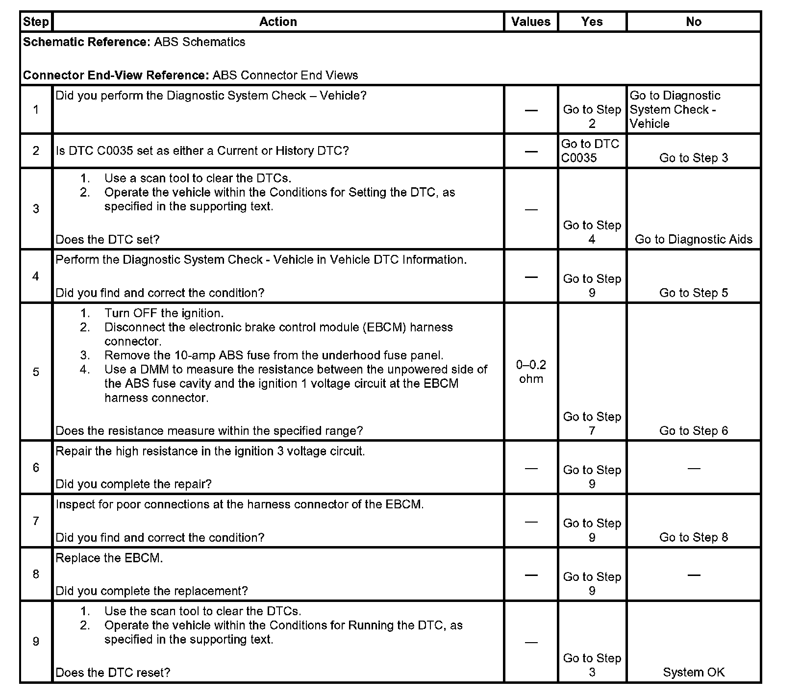 Although 2-20 seconds of low voltage detection are required to set this DTC, ABS related systems may be disabled by the EBCM during the fault detection process, and prior to setting this DTC. This means that the instrument panel cluster (IPC) may turn ON indicators, and fault messages, intermittently, without the EBCM setting any DTCs if low voltage faults are intermittent.
