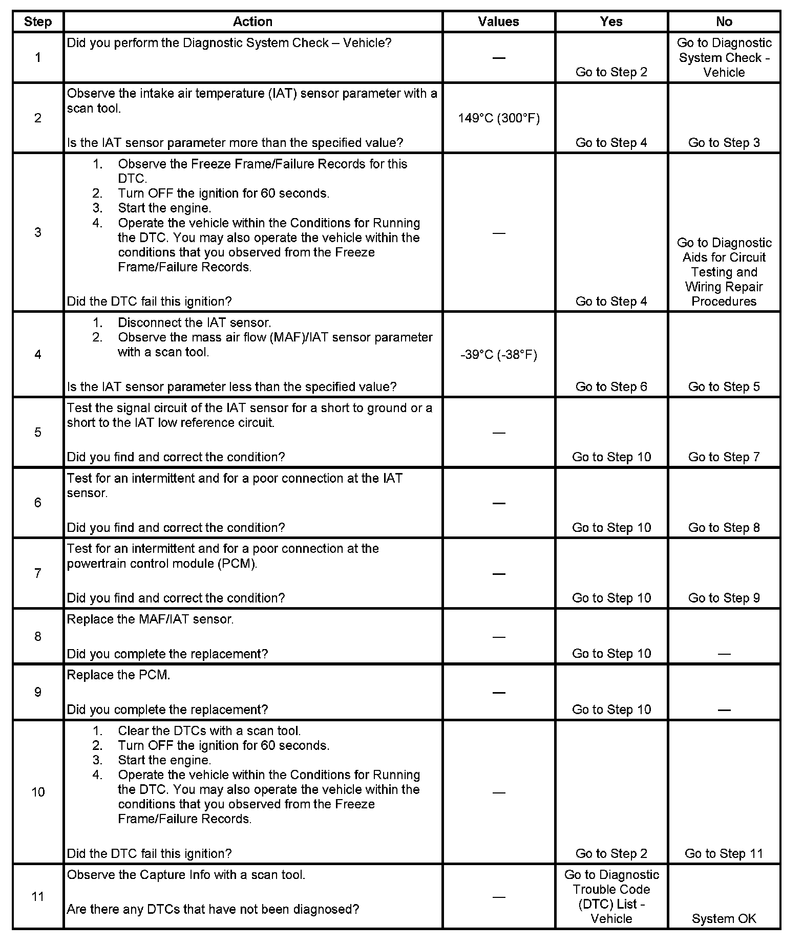 The PCM detects that the IAT sensor parameter is more than 149°C (300°F) for more than 5 seconds.