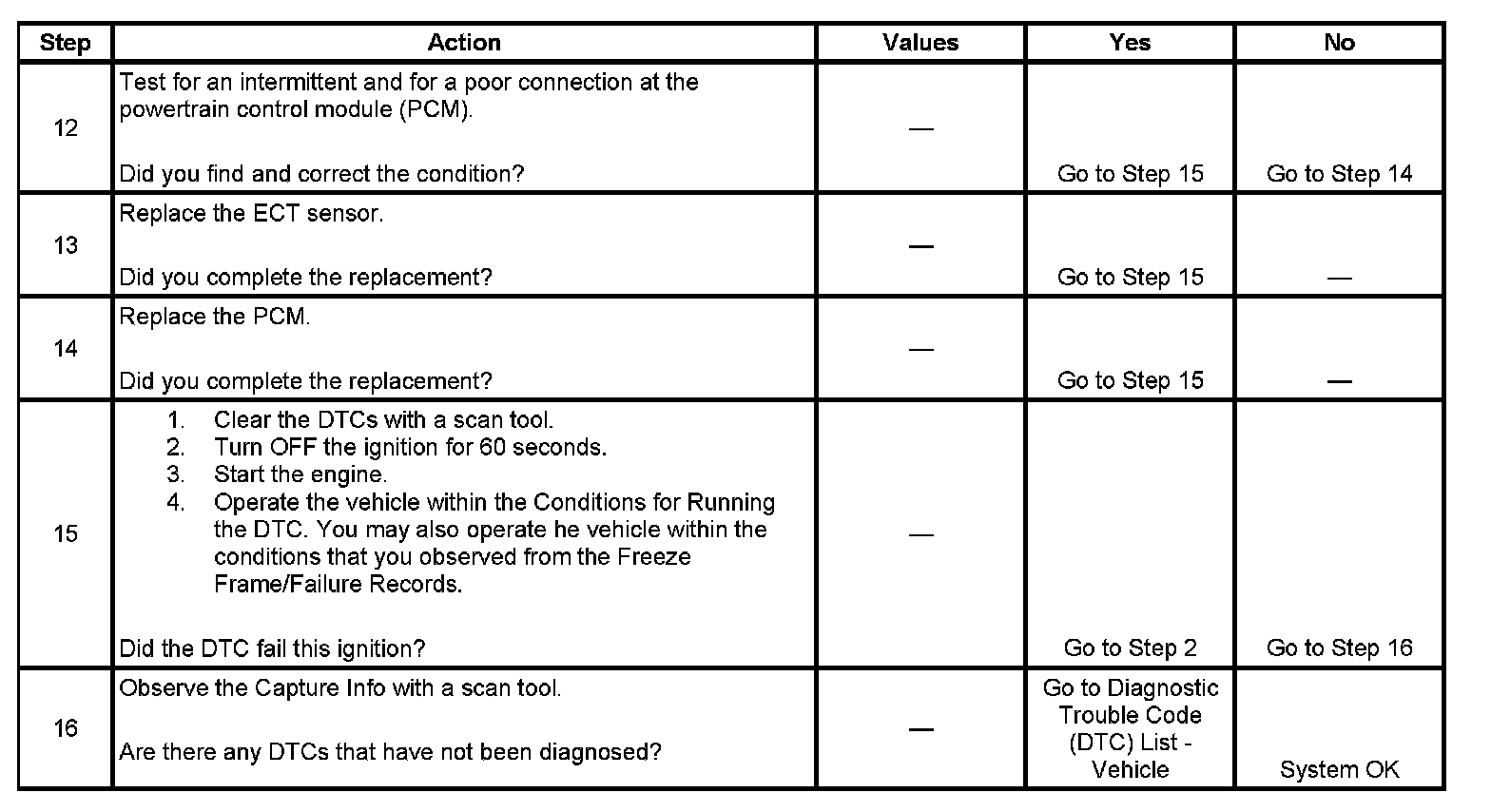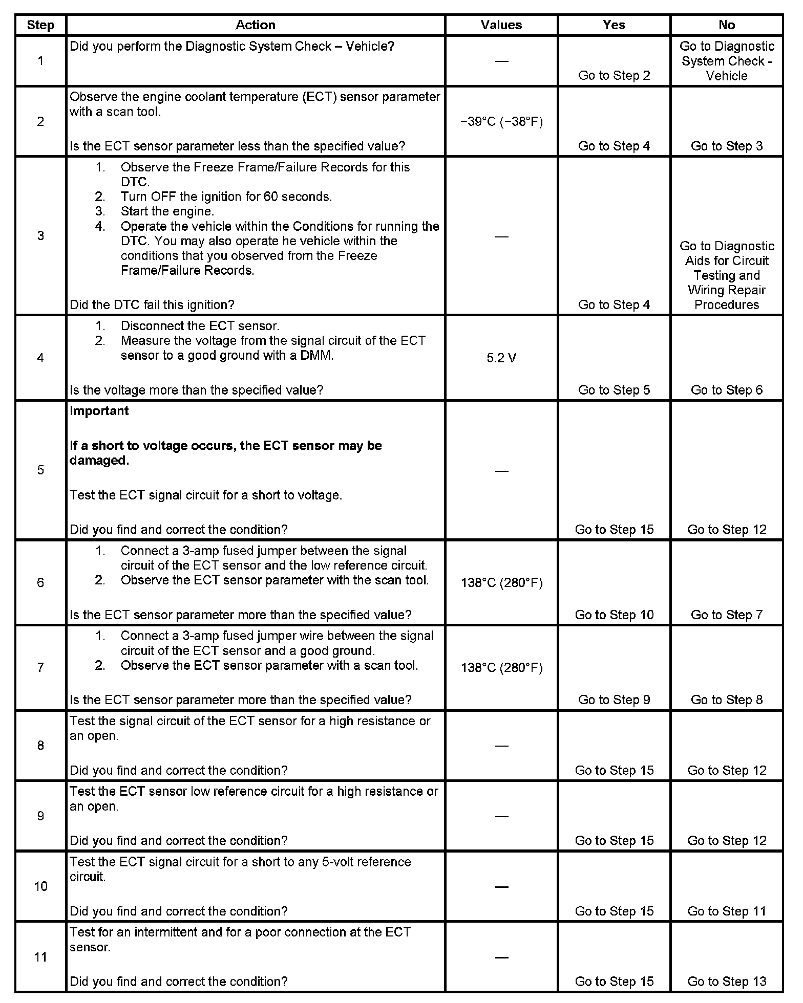 The engine coolant temperature (ECT) sensor is a variable resistor, that measures the temperature of the engine coolant. The ECT sensor has a signal circuit and a low reference circuit. The powertrain control module (PCM) supplies 5 volts to the ECT signal circuit and a ground for the ECT low reference circuit. When the ECT is cold, the sensor resistance is high. When the ECT increases, the sensor resistance decreases. With high sensor resistance, the PCM detects a high voltage on the ECT signal circuit. With lower sensor resistance, the PCM detects a lower voltage on the ECT signal circuit. If the PCM detects an excessively high ECT signal voltage, which is a low temperature indication, DTC P0118 sets.