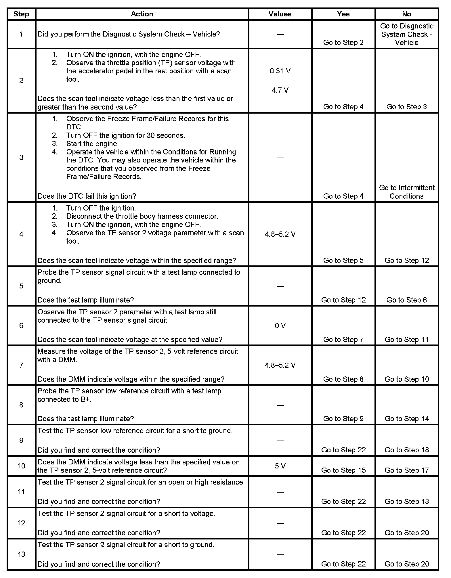 This provides the powertrain control module (PCM) with a signal voltage proportional to throttle plate movement. TP sensor 1 signal voltage at closed throttle is near the 5-volt reference and decreases as the throttle plate is opened. TP sensor 2 signal voltage at closed throttle is near the low reference and increases as the throttle plate is opened. If the PCM detects that the TP sensor 2 signal voltage is not within the predicted range, DTC P0220 sets.