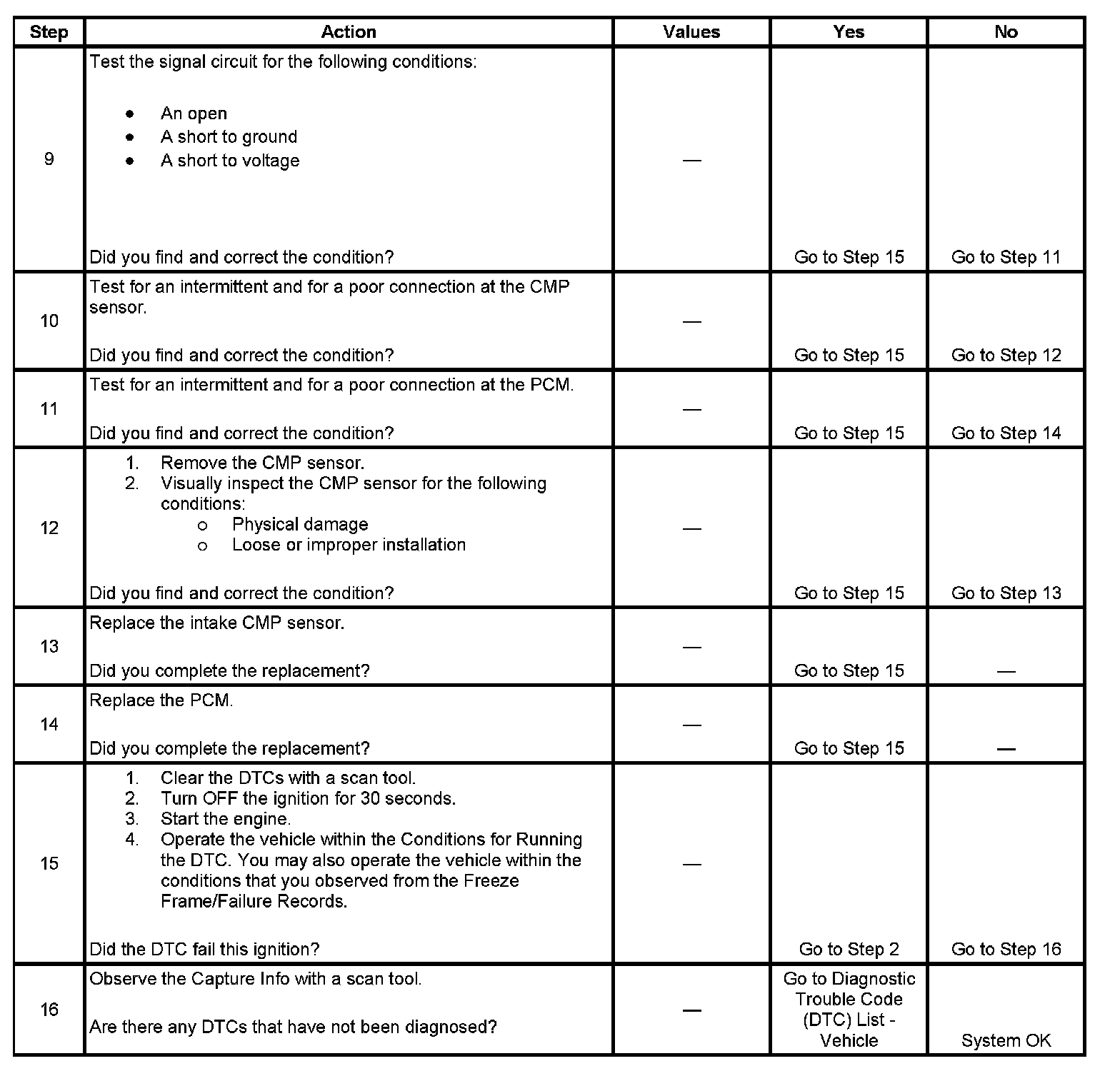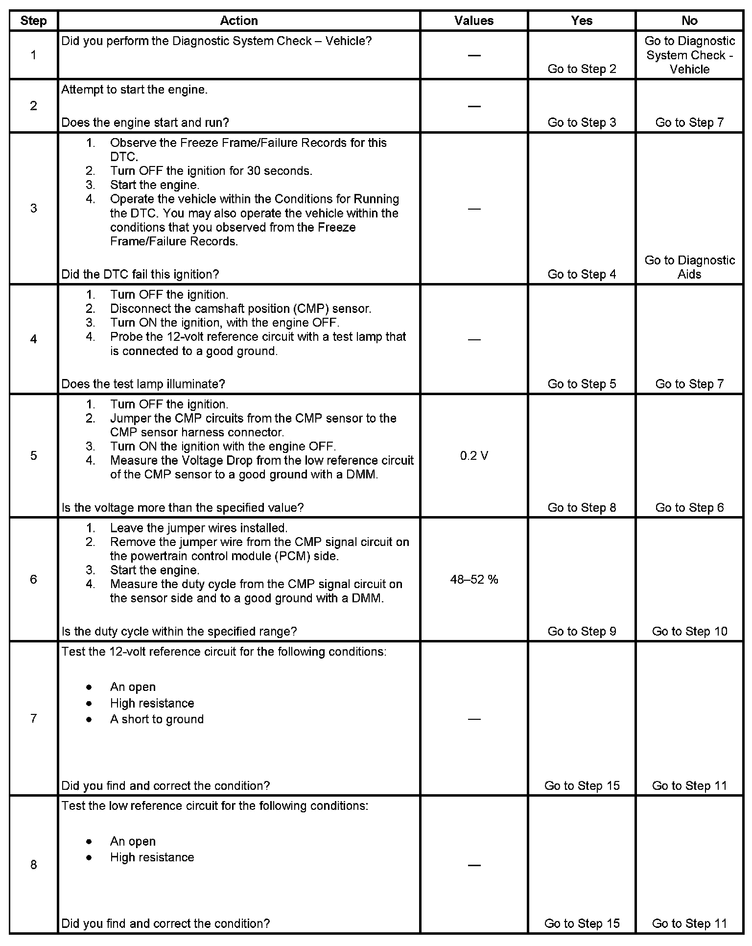 6. This step tests the output of the CMP sensor. If the duty cycle is not within the specified range the sensor is bad.