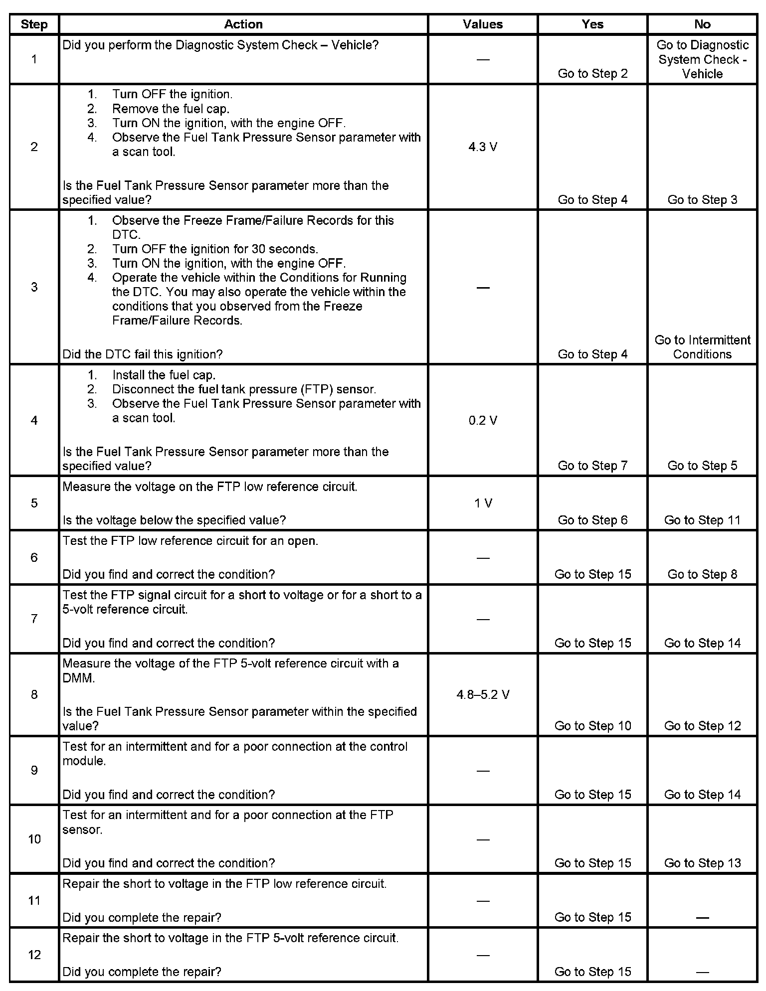 The fuel tank pressure (FTP) sensor measures the difference between the air pressure or vacuum in the evaporative emission (EVAP) system, and the outside air pressure. The control module supplies a 5-volt reference and a low reference circuit to the FTP sensor. The FTP sensor signal circuit voltage varies depending on EVAP system pressure or vacuum. If the FTP sensor signal voltage increases above a calibrated value, this DTC sets.