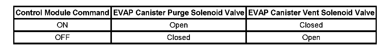 The table illustrates the relationship between the ON and OFF states, and the OPEN or CLOSED states of the EVAP canister purge and vent solenoid valves.