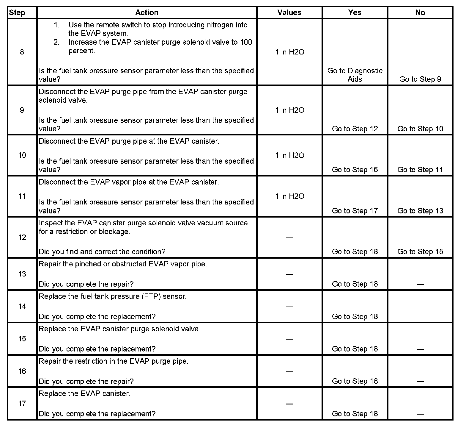 The control module tests the evaporative emission (EVAP) system for a large leak. The control module monitors the fuel tank pressure (FTP) sensor signal to determine the EVAP system vacuum level. When the conditions for running are met, the control module commands the EVAP canister purge solenoid valve OPEN and the EVAP canister vent solenoid valve CLOSED. This allows engine vacuum to enter the EVAP system. At a calibrated time, or vacuum level, the control module commands the EVAP canister purge solenoid valve closed, sealing the system, and monitors the FTP sensor input in order to determine the EVAP system vacuum level. If the system is unable to achieve the calibrated vacuum level, or the vacuum level decreases too rapidly, this DTC sets.