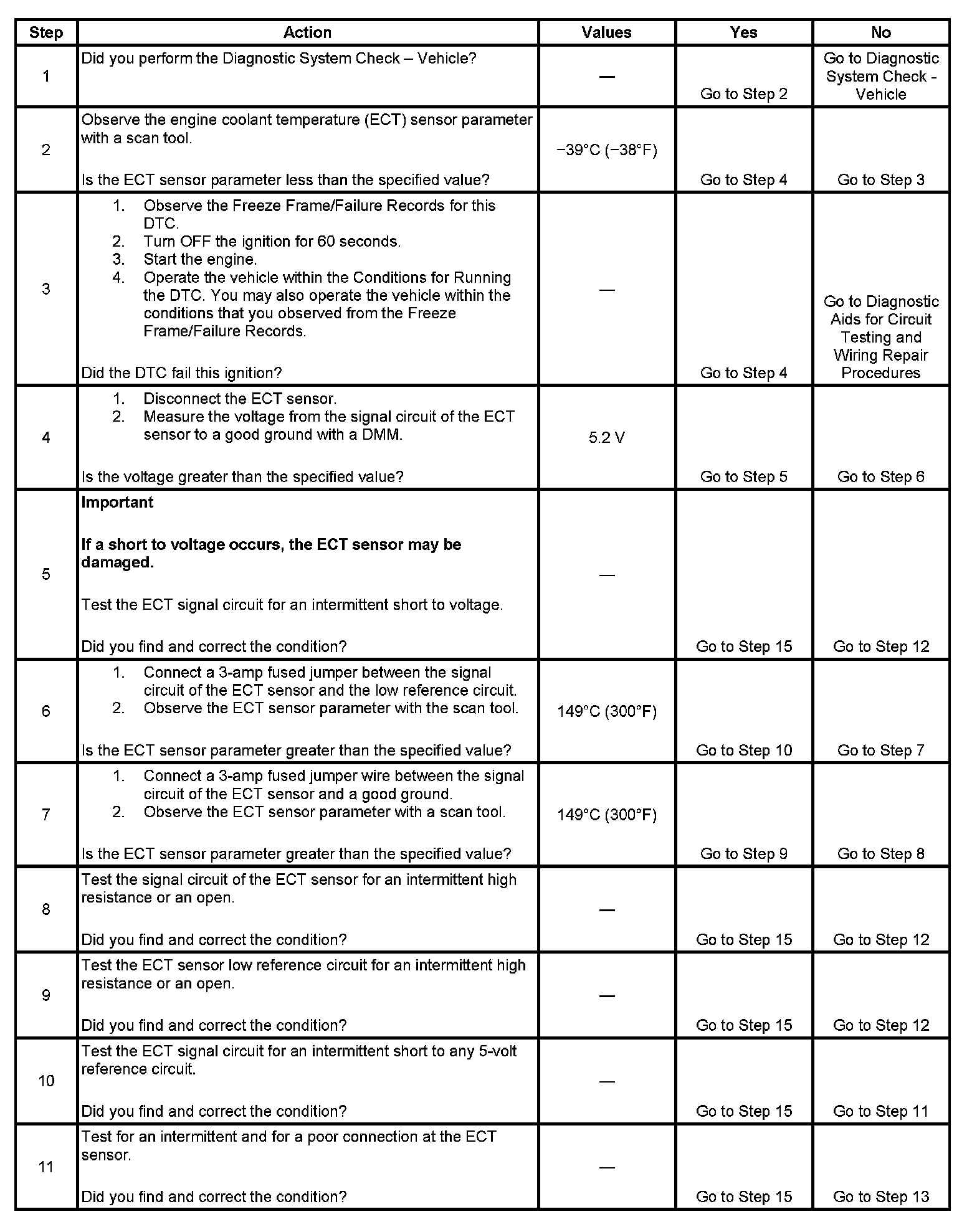 The PCM detects that the ECT sensor parameter is less than -39°C (-38°F) intermittently for more than 5 seconds.