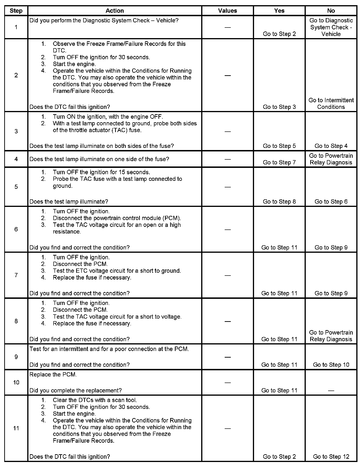 The throttle actuator control (TAC) system uses an ignition voltage supply separate from the powertrain control module (PCM) supply. If the PCM detects a voltage difference between the 2 circuits, this DTC sets.