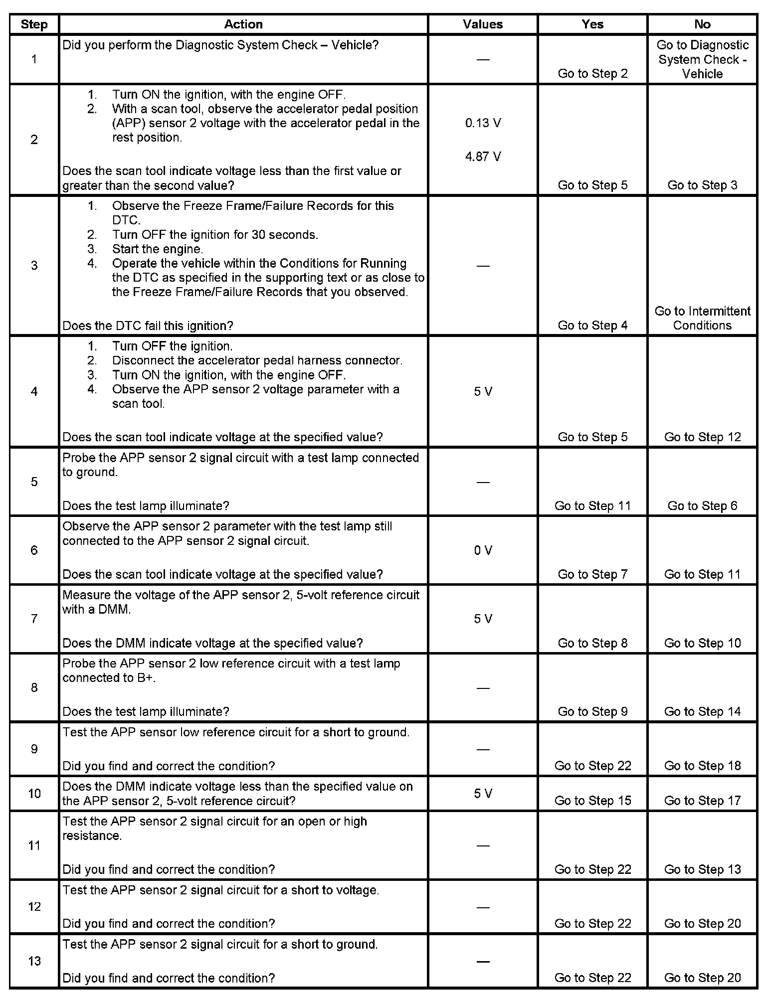 The APP sensor 2 voltage is less than 0.13 volt or more than 4.87 volts for more than 0.5 second.