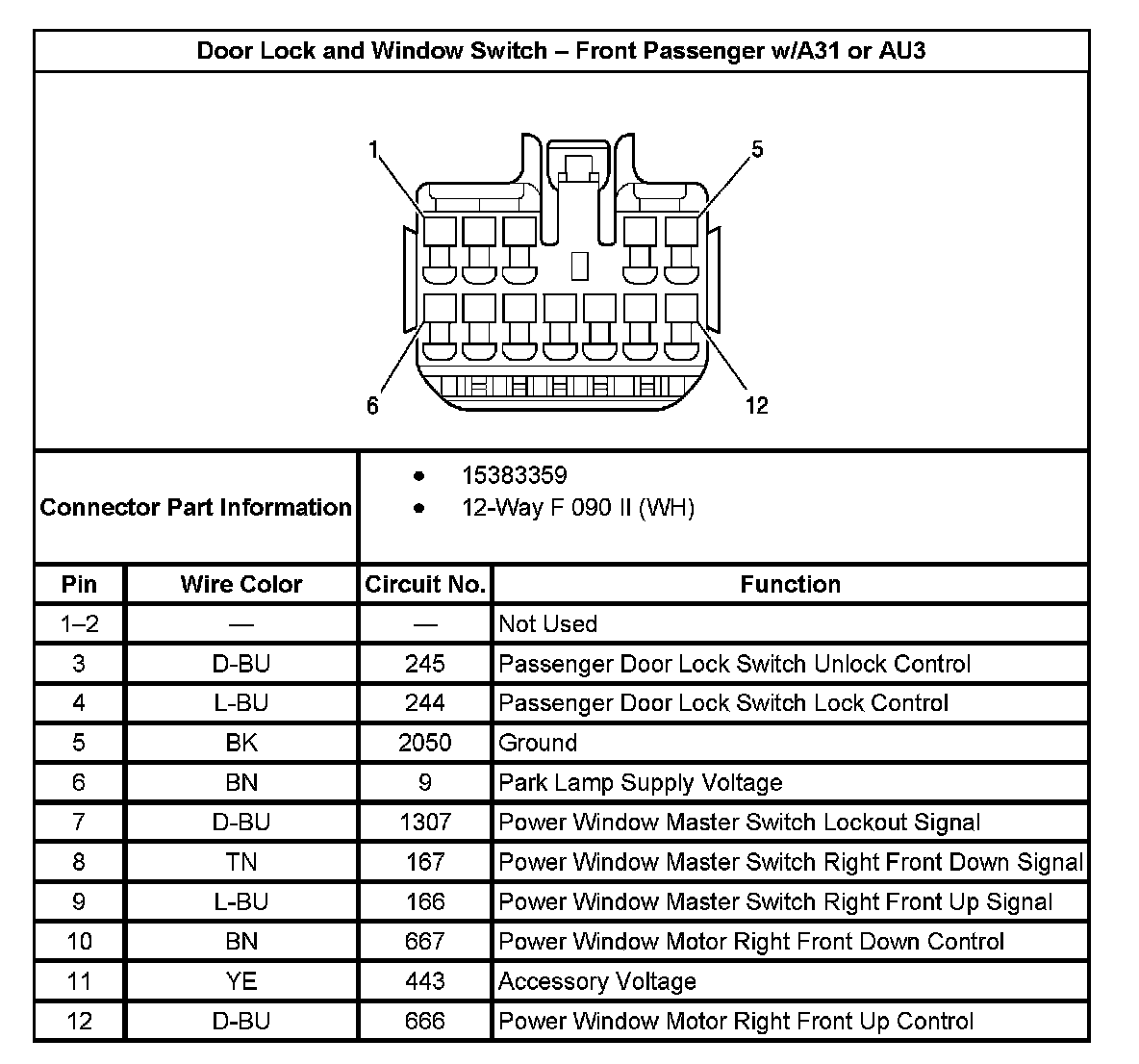 Door Lock and Window Switch - Front Passenger With RPO Code A31 Or AU3: