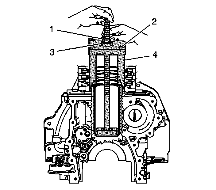 2. Install the cylinder bore sleeve puller EN 45680-402 (1) which is part of EN-45680-400, through the cylinder bore.