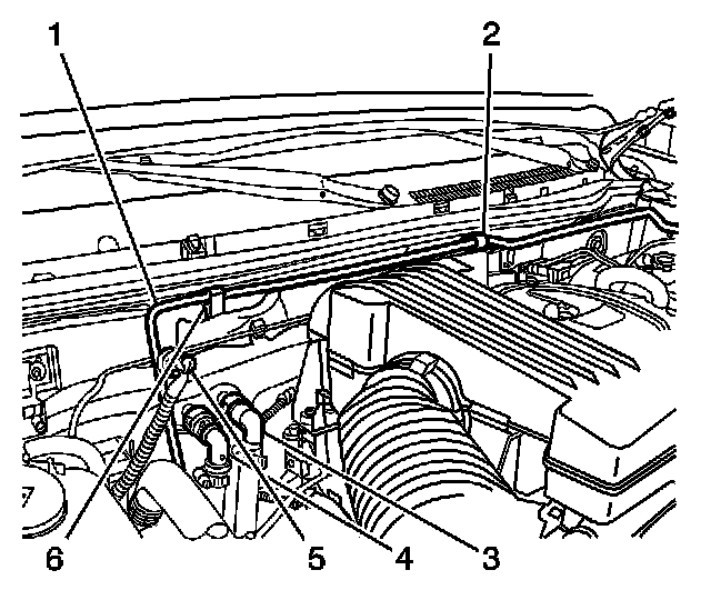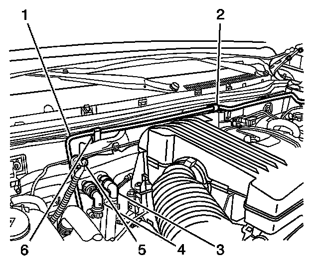 4. Install the evaporator tube to the retaining clips (2) on cowl and fender.
