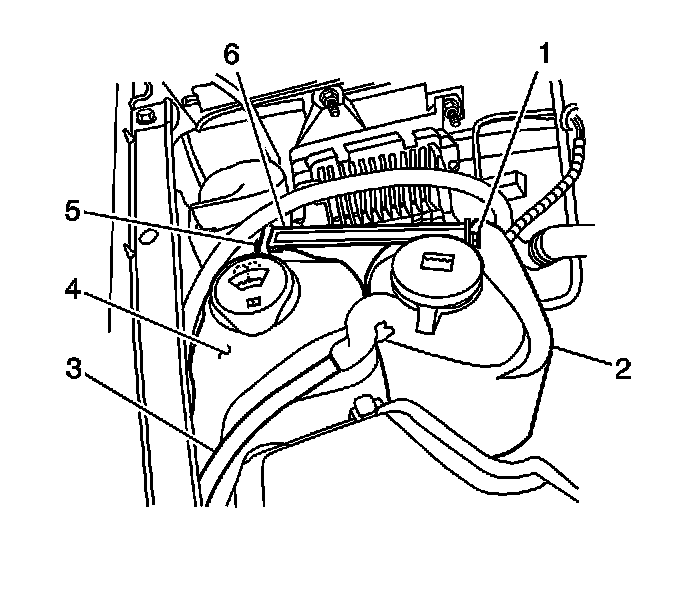 4. Remove the radiator vent inlet hose (3) from the coolant recovery reservoir (2).