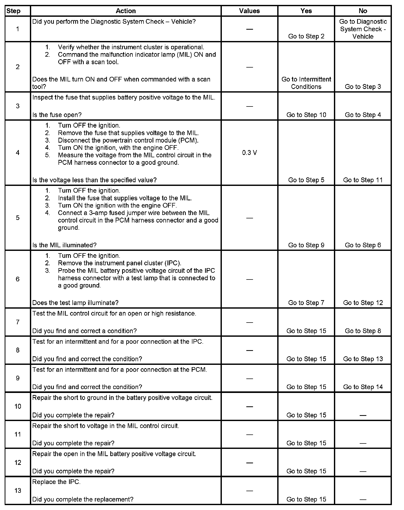 Battery positive voltage is supplied to the malfunction indicator lamp (MIL) through a logic module in the instrument panel cluster (IPC). The powertrain control module (PCM) turns the MIL ON by grounding the MIL control circuit. There should be a steady MIL with the ignition ON and the engine OFF.