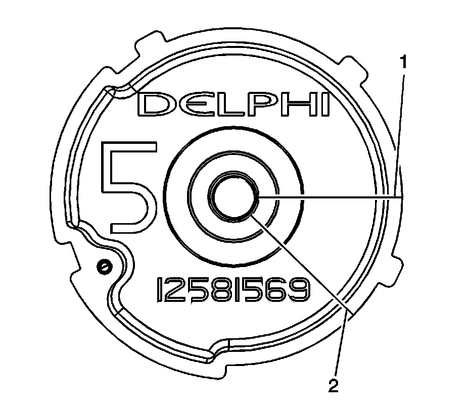 5. Scribe or draw a line (2) on the camshaft position actuator at that position.