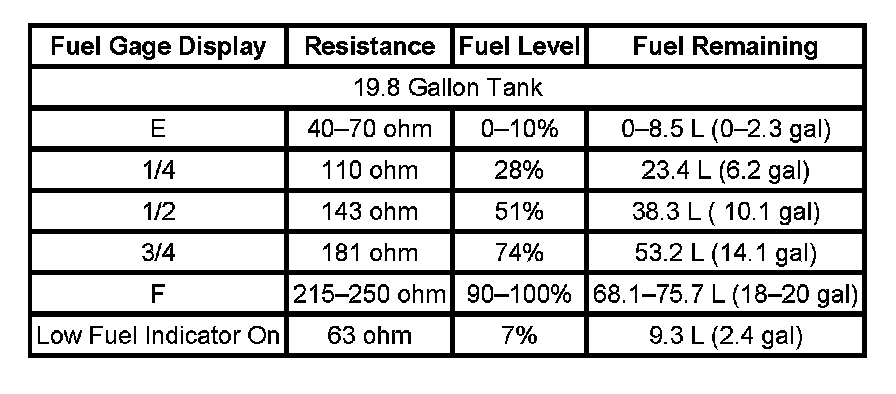The information in this table is intended for use with the J 33431-C Signal Generator and Instrument Panel Tester. The fuel level sensor values represent the test values to be used on the Signal Generator to drive the fuel gage display to the indicated positions. Vehicles that require more than one fuel level sensor calculate gage position from many possible resistance combinations of fuel levels between the two tanks. Therefore, the values in the table may not correlate directly to readings taken from the vehicle primary or secondary sending units.