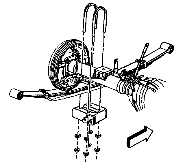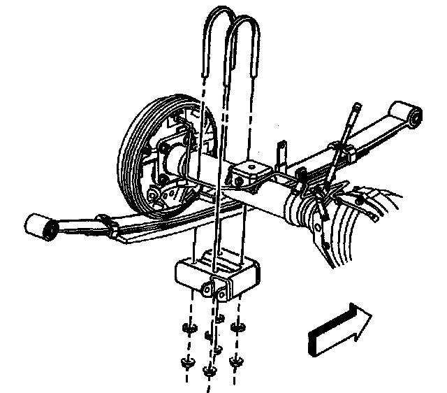When removing the rear suspension leaf springs, the U-bolts, washers and nuts must be replaced. DO NOT re-use the U-bolts, washers and nuts.