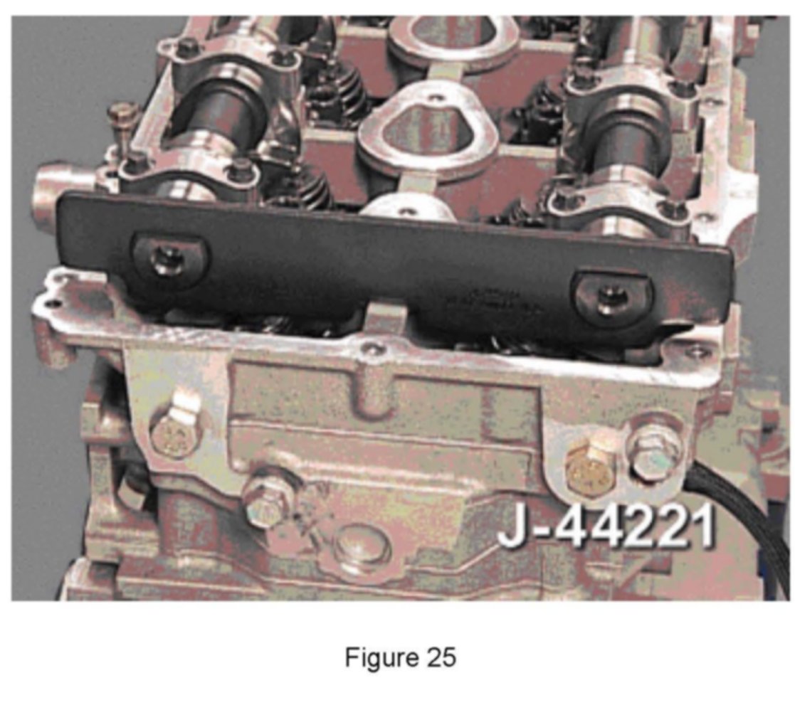 12. Remove the Camshaft Holding Tool J-44221 from the back of the camshafts. Refer to figure 21.