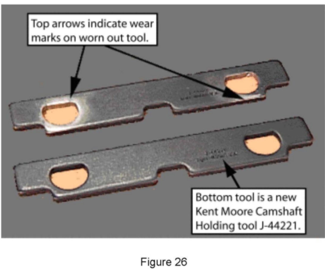 15. Both intake and exhaust camshaft flats should be facing up and flat with the cylinder head. If the Kent Moore Camshaft Holding Tool J-44221 is used to verify cam timing, you could be off approximately one tooth and cause DTC P0017 to set. Refer to figure 25. Figure 26 shows a worn out Kent Moore Camshaft Holding Tool (top) and a new Camshaft Holding Tool (bottom). If a worn or new Kent Moore Camshaft Holding Tool J-44221 is used to verify timing, the timing will be off.