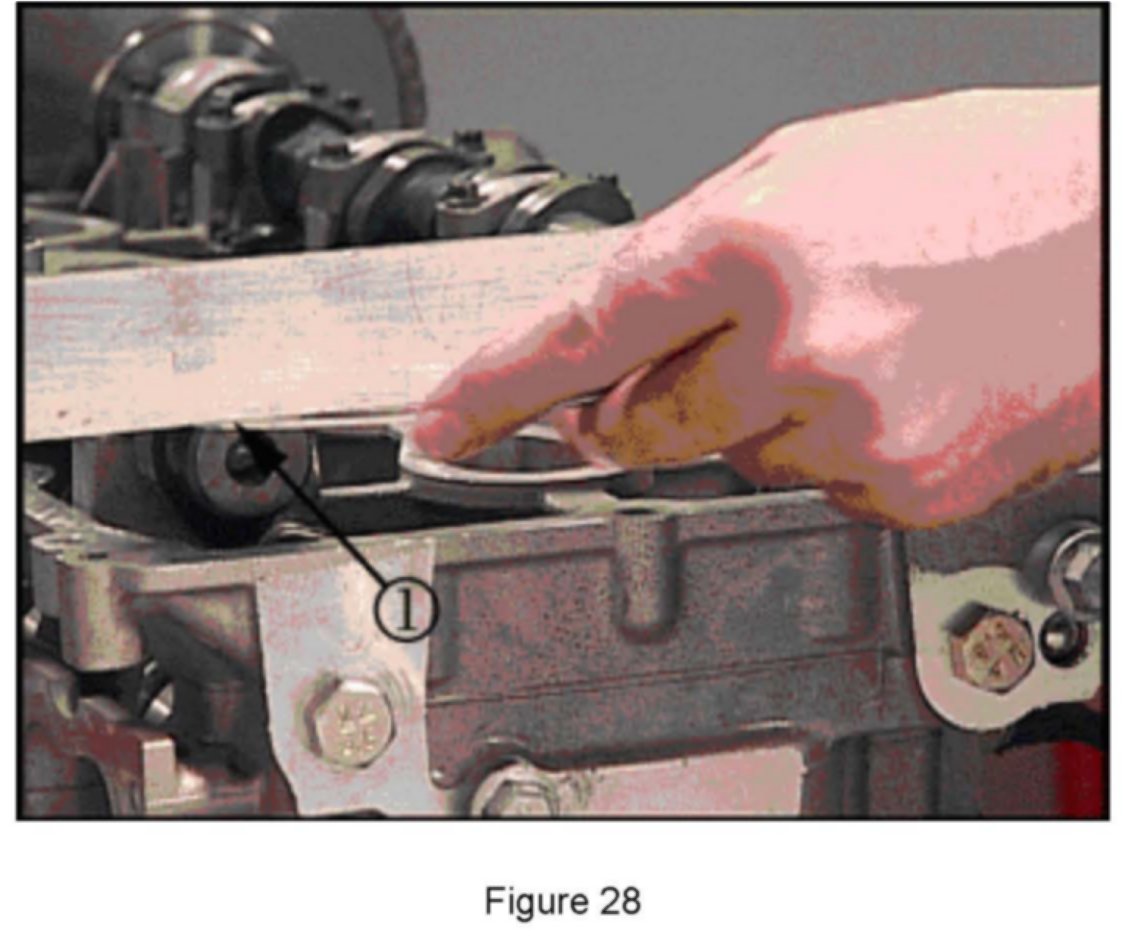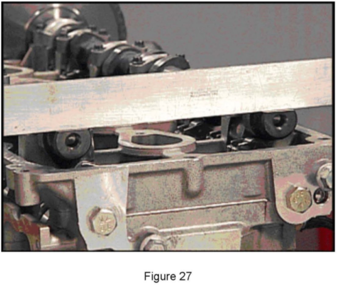 16. To verify timing, set a straight edge across the flats of the camshafts. Refer to figure 27. Both camshaft flats should be flat. There may be some variation of build and the straight edge may not lay perfectly flat across back of the camshafts. If one or both camshaft flats are off, then the timing is off. Refer to figure 28 (1). Repeat procedure 15 and recheck. If the camshaft flats are still not flat, the camshaft timing will have to be reset. This may require removal and reinstallation of one or both camshaft sprockets. Refer to previous step # 46 in this bulletin.