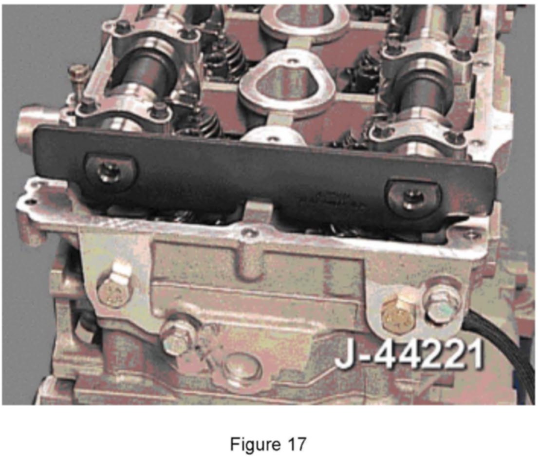 3. Install the camshafts with the flats up using the Kent Moore Camshaft Holding Tool J-44221 as shown in figure 17. Refer to Camshaft Installation in the Service Manual.