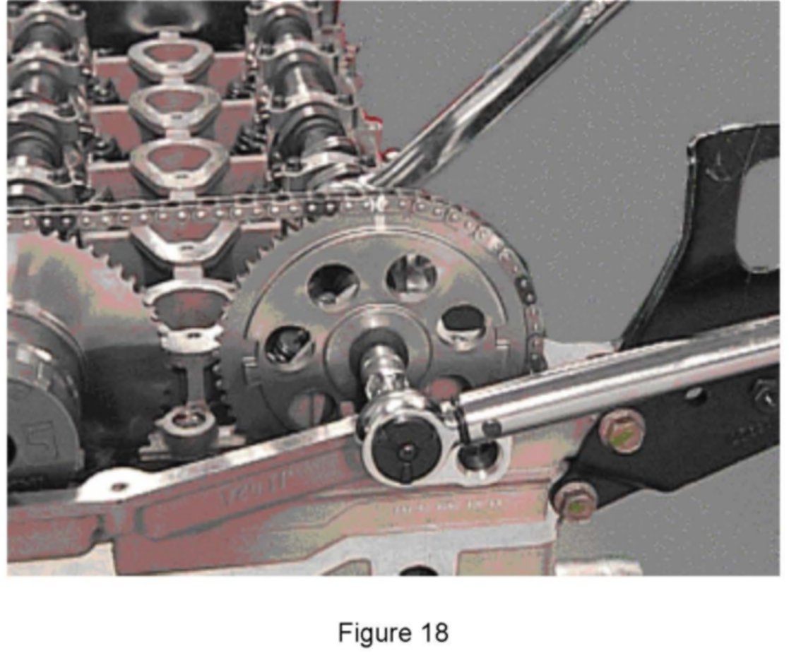6. Tighten the new intake camshaft sprocket bolt. Refer to figure 18.