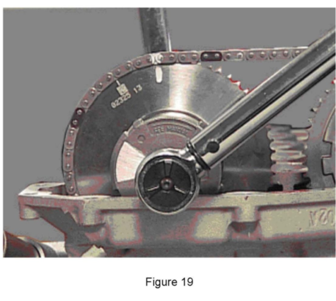 7. Tighten the new exhaust camshaft actuator sprocket bolt. Refer to. figure 19.