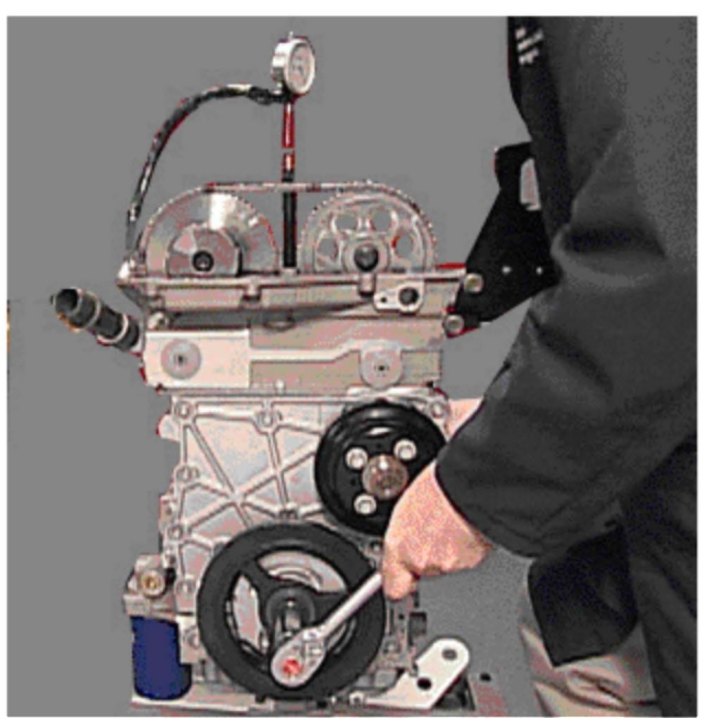 14. Rotate the engine clockwise by hand two complete revolutions to TDC # 1 on the compression stroke. Refer back to step 41 (perform the following Service Timing Procedure) in this bulletin. If you go past TDC, rotate the engine back approximately 45 degrees before TDC and then rotate clockwise up to TDC to ensure that the timing chain is tight (no slack) between the crank sprocket and the timing gears. Refer to figure 23.
