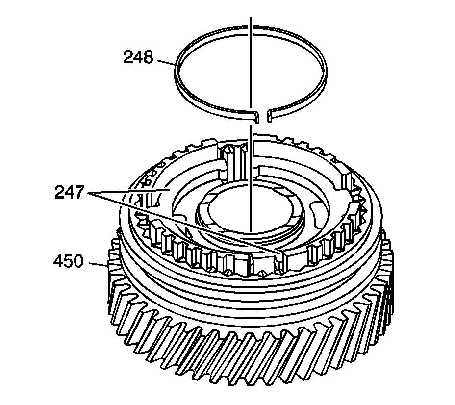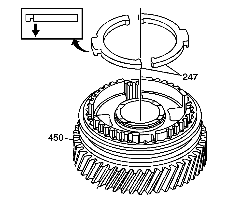 2. Install the 5th gear synchronizer inserts (247) into the 5th countershaft gear (450) with the tab down, into the wide slot.