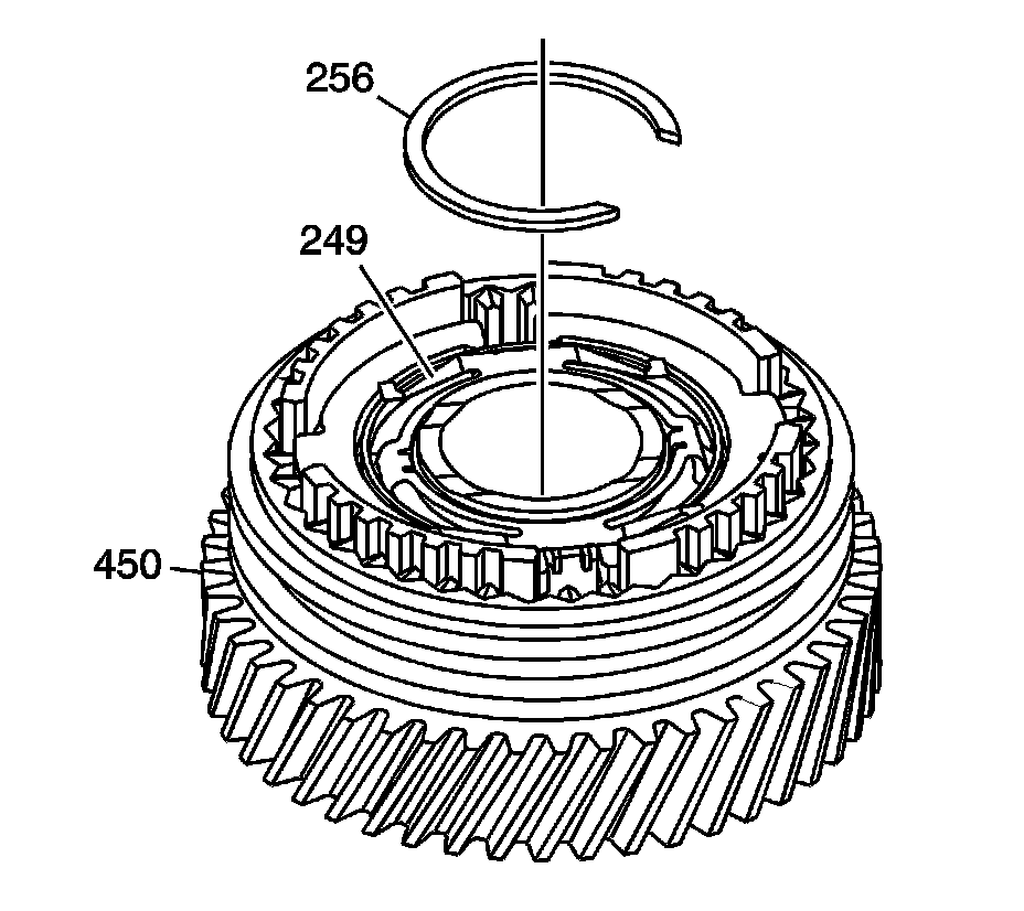 5. Compress the 5th/reverse synchronizer spring (249) and install the retaining ring (256) onto the 5th countershaft gear (450).