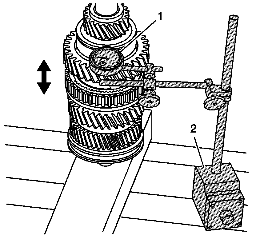 Using J 8001-3 or J 26900-12 (1) and J 26900-13 (2), measure the 1st gear axial play.