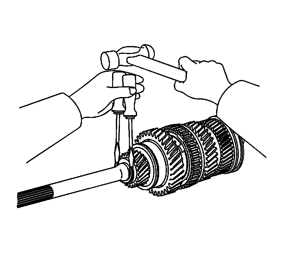 14. Using 2 screwdrivers and a hammer, remove the 1st/2nd synchronizer hub retaining ring.