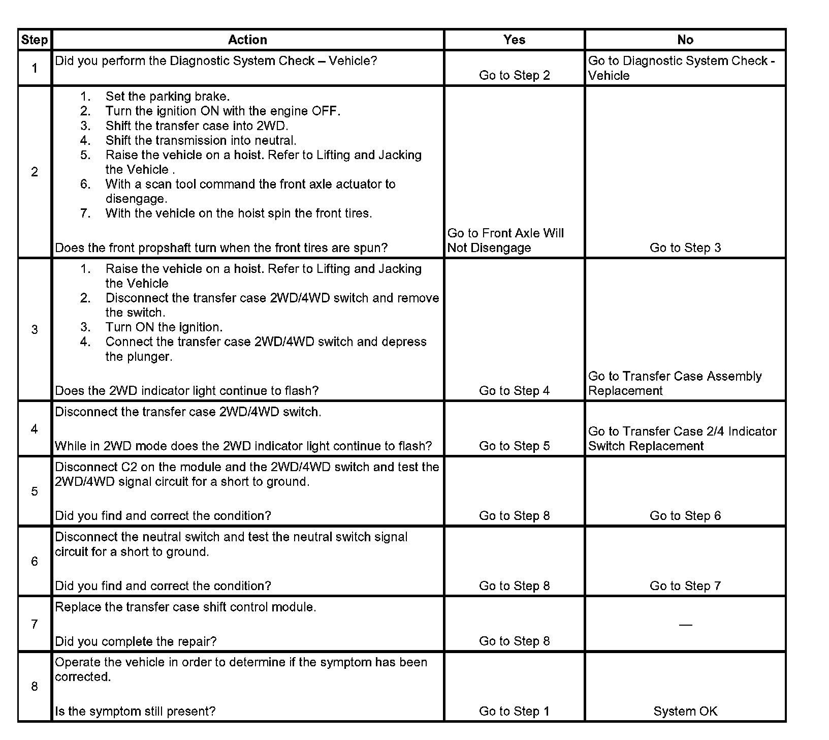 The Isuzu T150 transfer case contains a 2WD/4WD switch, which is supplied battery voltage by the transfer case shift control module. When the transfer case mode selection is in either 4WD low or 4WD high the 2WD/4WD switch provides a path to ground, pulling the 2WD/4WD signal circuit low. This assists the transfer case shift control module in determining the present mode. A fault in the 2WD/4WD signal circuit, or the neutral switch signal circuit will cause the 2WD mode indicator to flash. A fault in the front axle actuator or the corresponding front axle actuator circuits can also cause the 2WD mode indicator to flash. In the 2WD mode the switch is open and the voltage on the 2WD/4WD signal circuit is battery voltage.