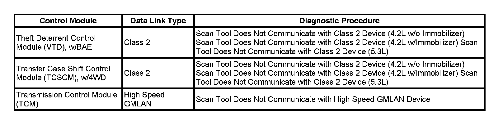 This table identifies which serial data link that a particular module uses for in-vehicle data transmission. Some modules may use more than one data link to communicate. Some modules may have multiple communication circuits passing through them without actively communicating on that data link. This table is used to assist in correcting a communication malfunction. For the description and operation of these serial data communication circuits refer to Data Link Communications Description and Operation.