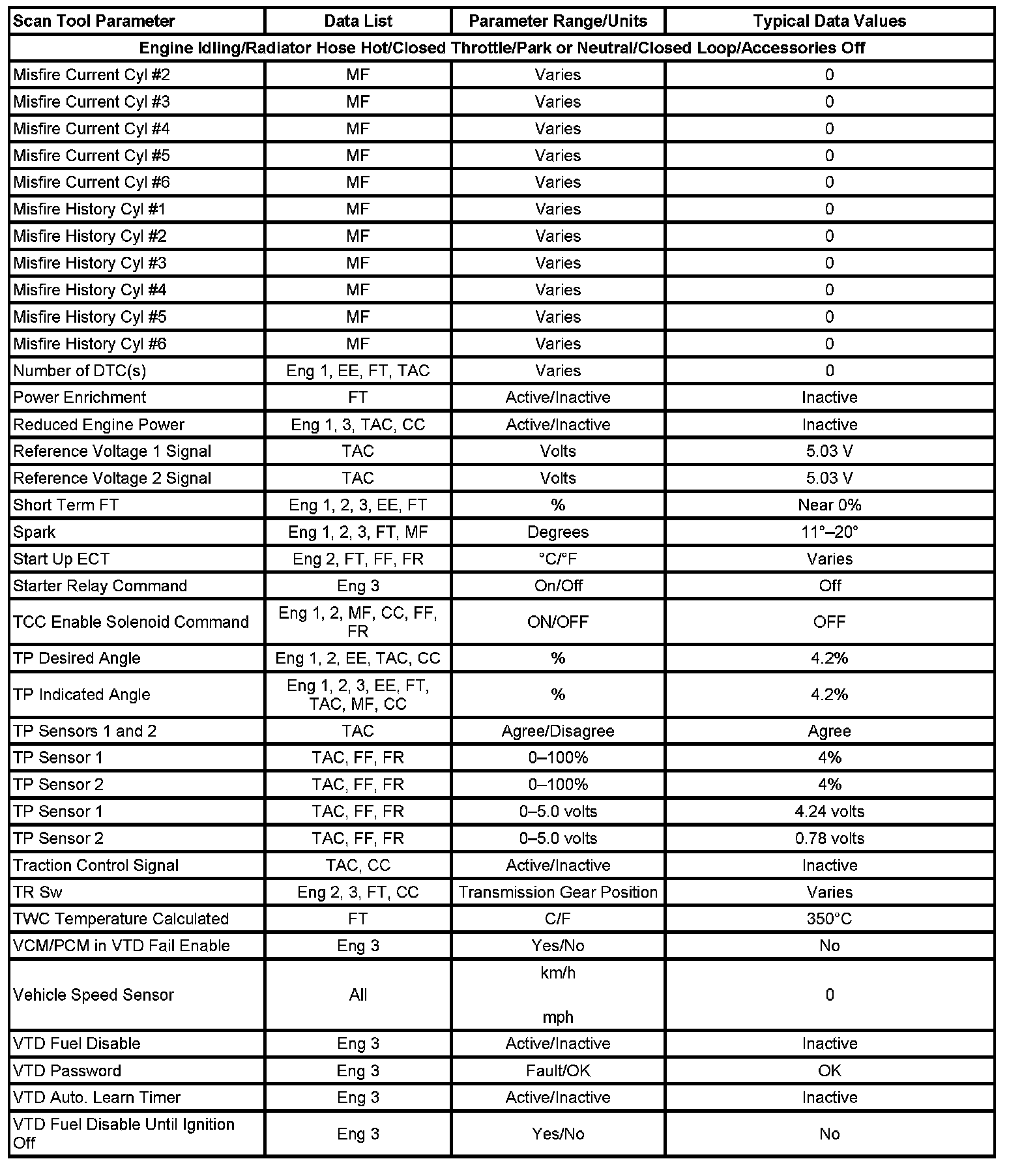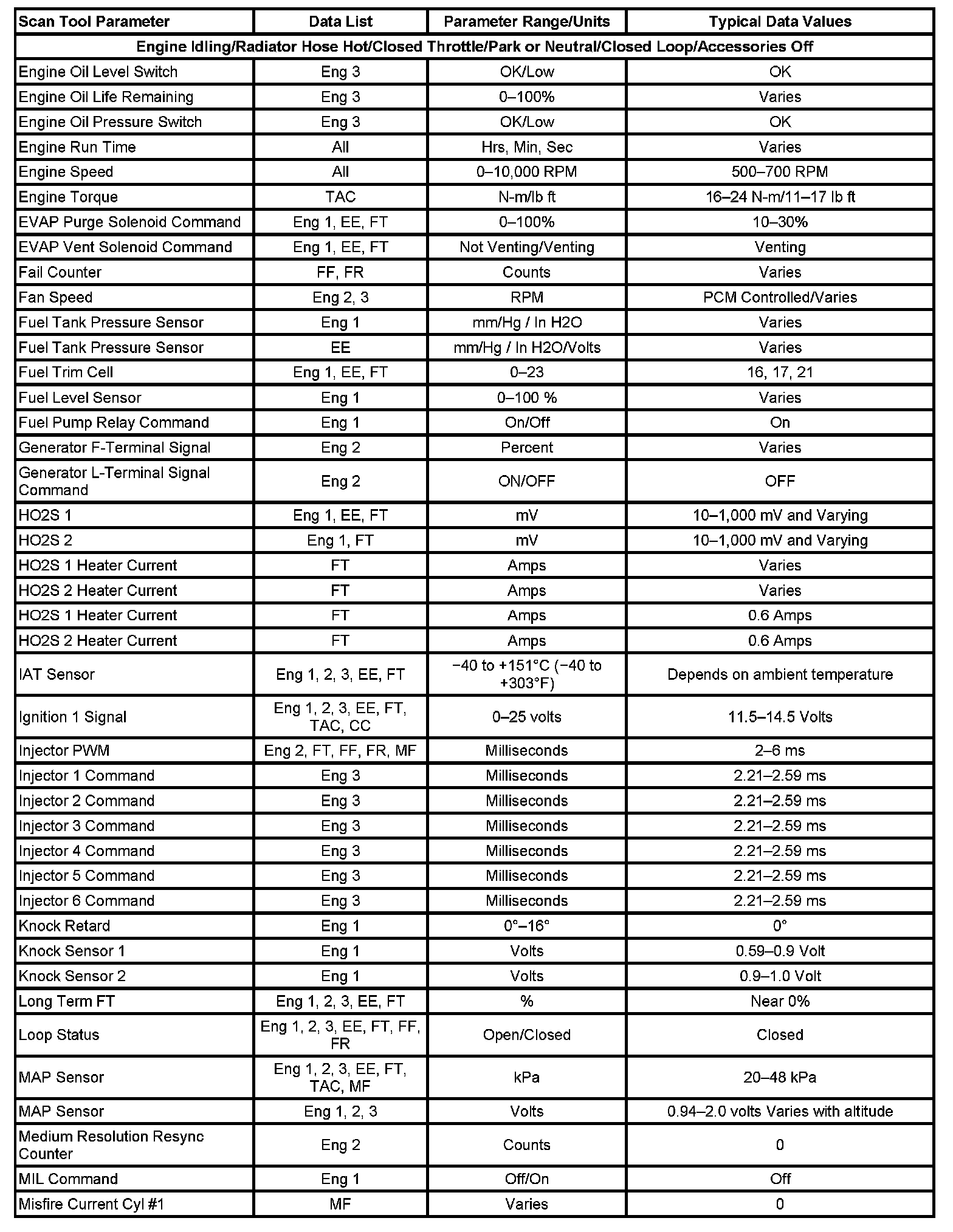 The Engine Scan Tool Data List contains all engine related parameters that are available on the scan tool. The list is arranged in alphabetical order. A given parameter may appear in any one of the data lists, and in some cases may appear more than once, or in more than one data list in order to group certain related parameters together.