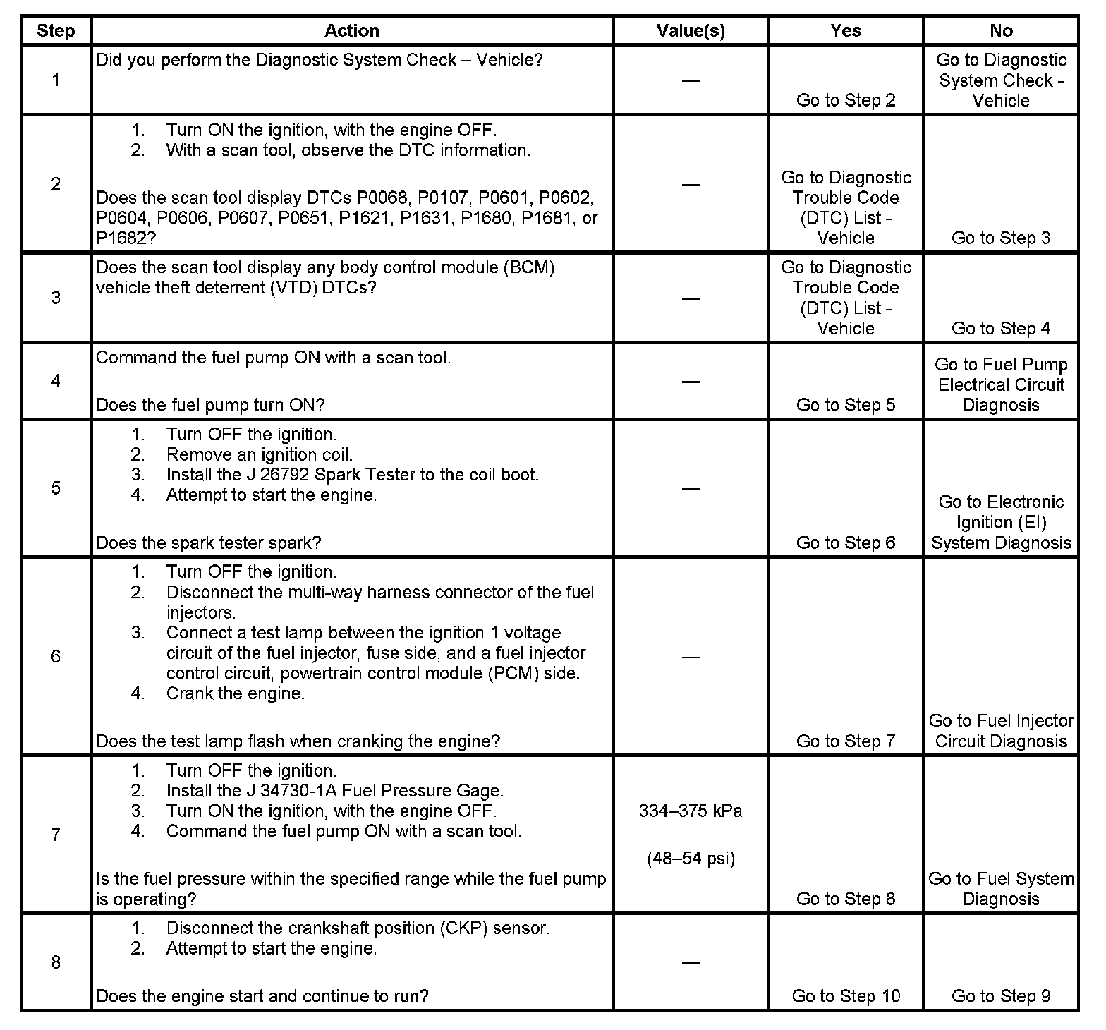 The Engine Cranks but Does Not Run diagnostic table is an organized approach to identifying a condition that causes an engine not to start. The Engine Cranks but Does Not Run diagnostic table directs the service technician to the appropriate system diagnosis.