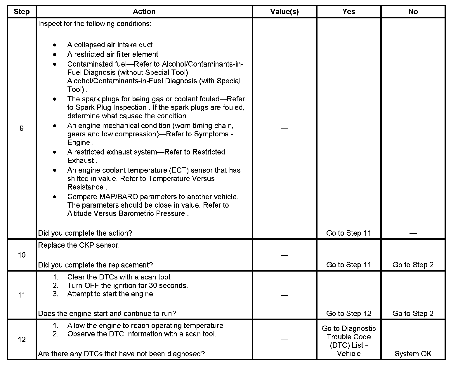 The Engine Cranks but Does Not Run diagnostic table assumes the following: