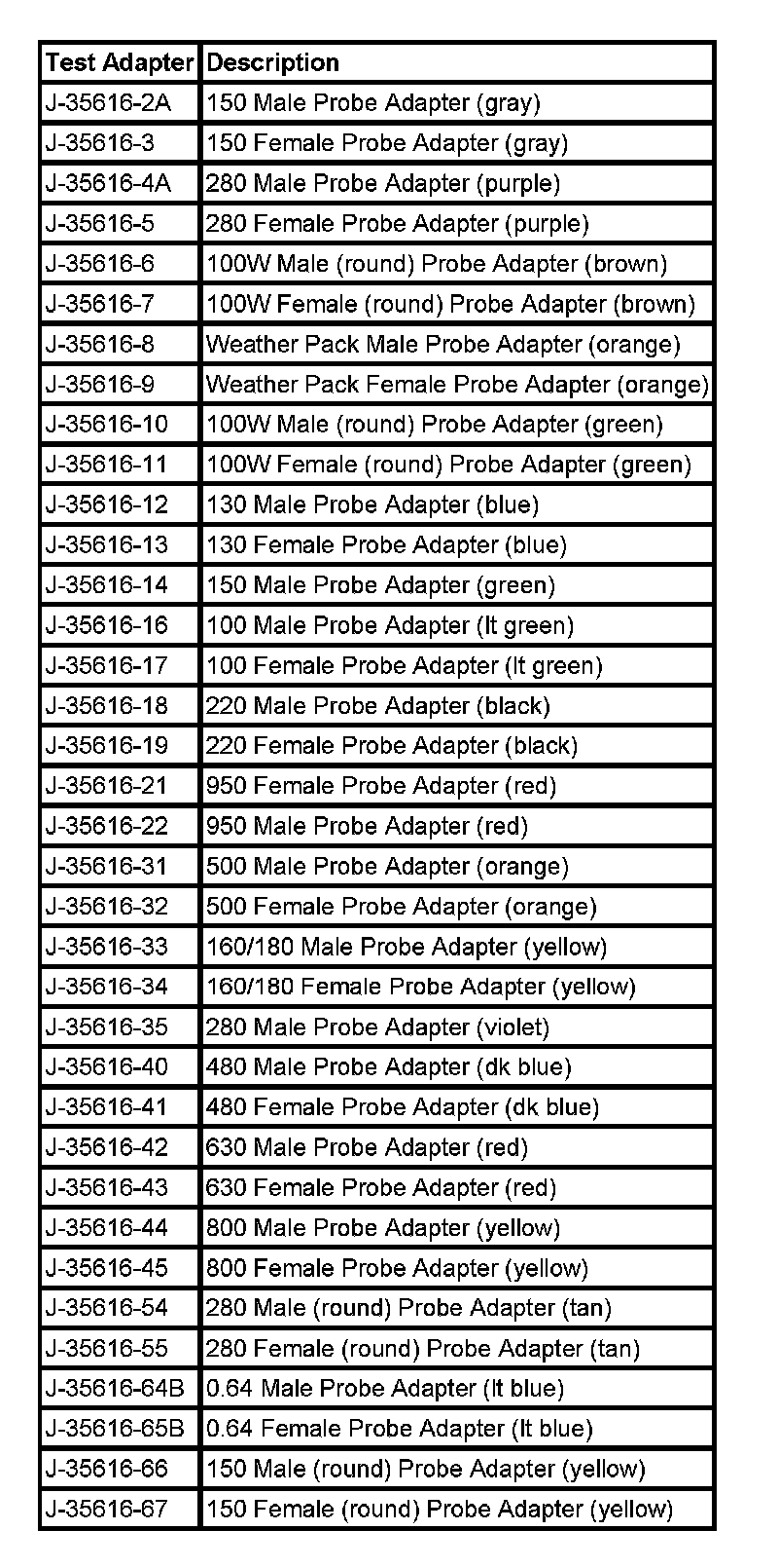 Refer to the following table as a guide in selecting the correct test adapter for front probing connectors: