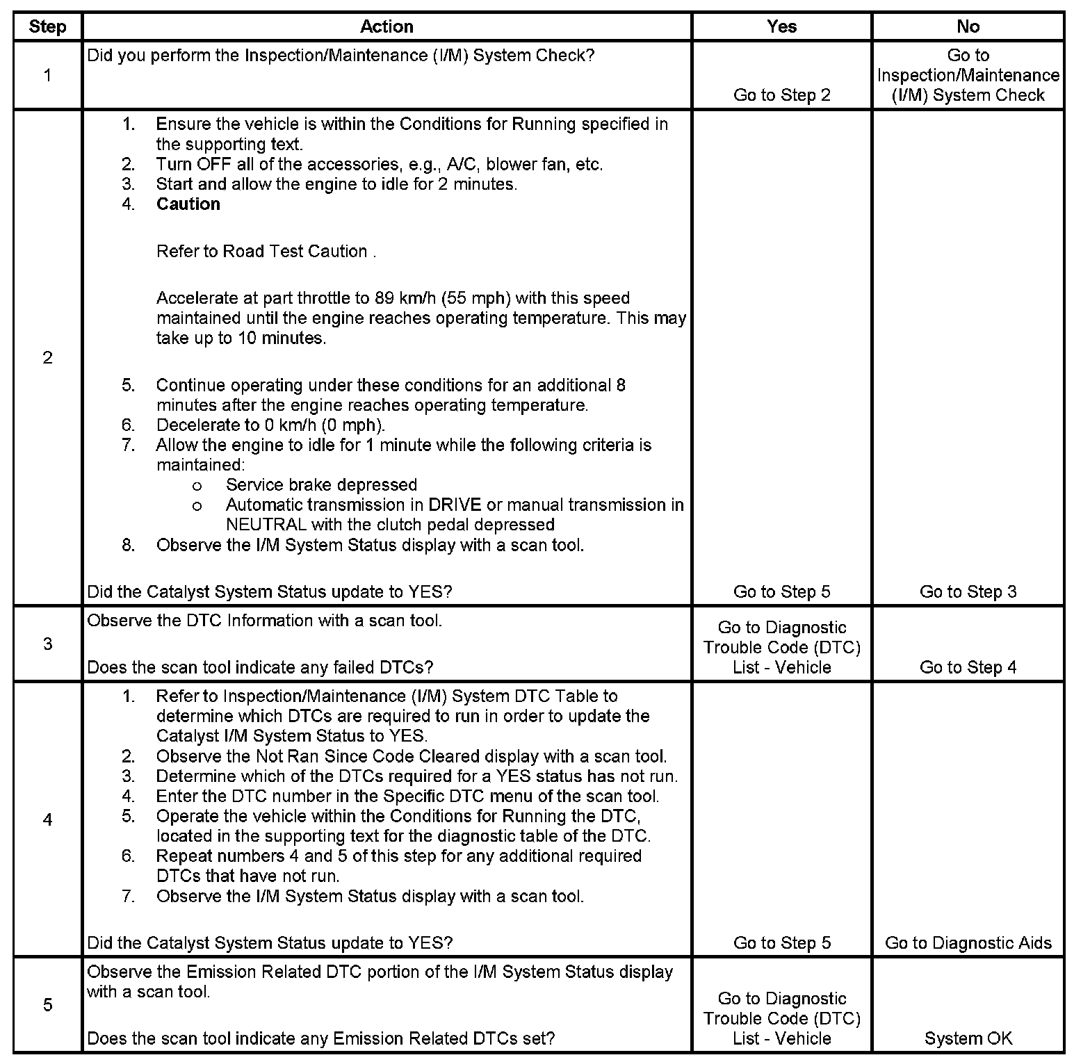 The purpose of this procedure is to satisfy the enable criteria necessary to execute an inspection/maintenance (I/M) system monitor for the catalyst system. The system monitor is comprised of the test results from one or more DTCs. This procedure may be used to set the Catalyst I/M System Status display on the scan tool to YES. The Catalyst I/M System Status display indicates whether or not the control module has completed the system monitor. The system monitor completes when either all DTCs comprising the monitor run and pass, or any DTC comprising the monitor illuminates the malfunction indicator lamp (MIL). If one of the DTCs comprising the monitor is set and the MIL is not illuminated, the necessary trips are required to illuminate the MIL before the monitor will complete. Once the monitor completes, the Catalyst I/M System Status display will be updated to YES.