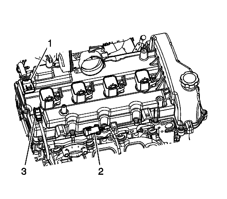 64. Connect the engine wiring harness retainer (2) to the camshaft cover (3).