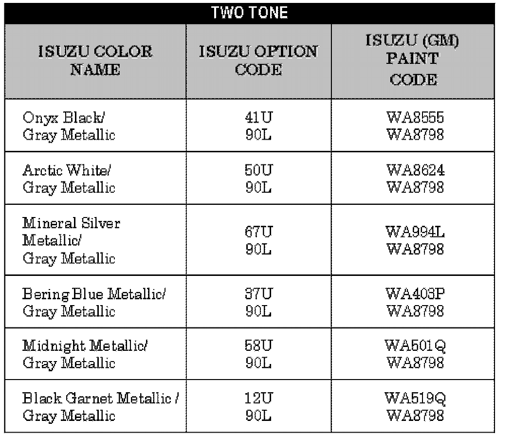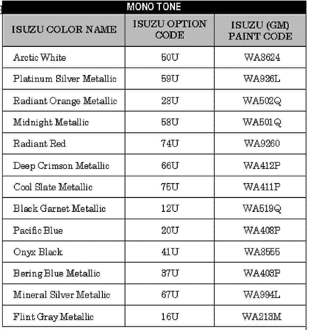 This bulletin lists exterior paint color information for 2008 Isuzu Ascender and i-290/i-370. The mono tone and two tone color combination charts list Isuzu paint colors, Isuzu option codes and Isuzu (GM) paint codes.The Isuzu option code and Isuzu (GM) paint code are printed on the Service Parts Identification Label inside the passenger glove compartment (see figure 1).
