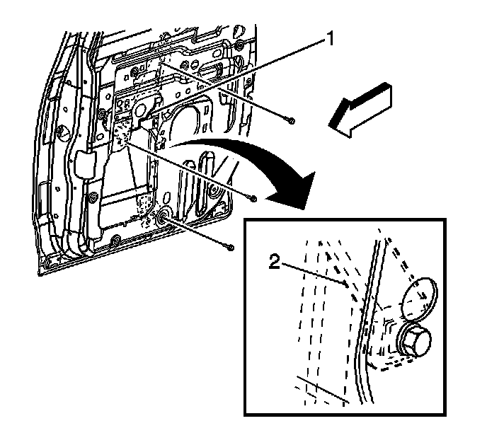 8. Loosen the bolts retaining the window regulator (1) to the inner door at the keyhole slot (2) locations.
